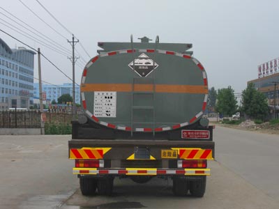 運送介質品名:稀鹽酸;介質密度:1050千克/立方米;類項號:8;罐體有效容積18.2立方米;罐體外形尺寸(長×長軸×短軸)(mm):9000×2100×1300。軸距(mm) : 2100+4700+1350,對應后懸(mm) : 2370;軸距(mm) : 2100+4500+1350,對應后懸(mm) : 2570。防護材料:Q235A碳鋼,連接方式:左右側面及后下部防護均采用焊接連接,后部防護斷面尺寸(mm):100×50,后部防護離地高度(mm):520, 隨底盤選裝平頂駕駛室整車高為(mm):3150, 額定載質量 18200kg對應準乘3人,18265kg對應準乘2人, ABS系統生產廠家:長春科密汽車制動有限公司,型號:CM4XL。僅采用CA6DL2-31E4發動,對應油耗值為(L/100km):44.5。前輪安裝盤式制動器,裝配限速裝置,限速79km/h, 僅采用底盤子午線輪胎和帶ABS的底盤,安裝帶有衛星定位功能的行駛記錄儀。