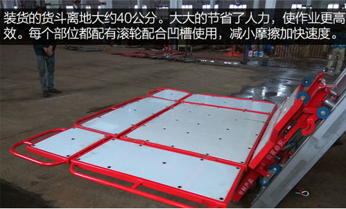 裝貨的貨斗離地大約40公分。大大的節(jié)省了人力,使作業(yè)更高效。每個部位都配有滾輪配合凹槽使用,減小摩擦加快速度。