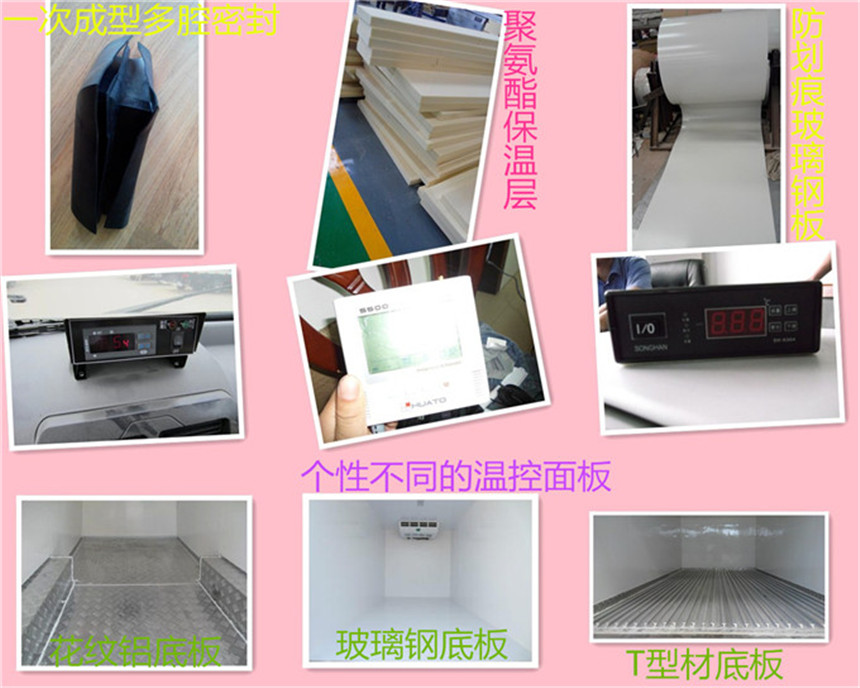 廂板材質:內外壁板選用國內優質的機制2.2mm玻璃鋼;中間保溫材料選用厚進口聚氨酯; 廂體厚度80mm 門厚度80mm;底板上面整體鋁花紋板,下面彩鋼板,中間進口聚氨酯;
