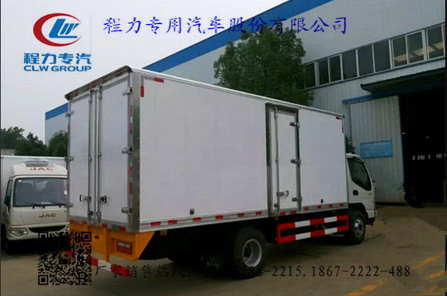 2.上裝配置:冷藏廂體內部有效尺寸:長5.2米×寬2.1米×高2.2米,廂體蒙皮采用內外玻璃鋼,隨客戶選擇內置槽鋼焊接骨架或者玻璃纖維超輕高強度骨架,填充8cm聚氨酯保溫層,不銹鋼包角,不銹鋼門框,不銹鋼門鎖件,防滑花紋鋁底板,選裝右側雙開門貨箱以及單開門貨箱,-5或者-18度制冷機組可以選擇,選裝T型材通風槽,導軌、肉鉤、雙溫機組等。